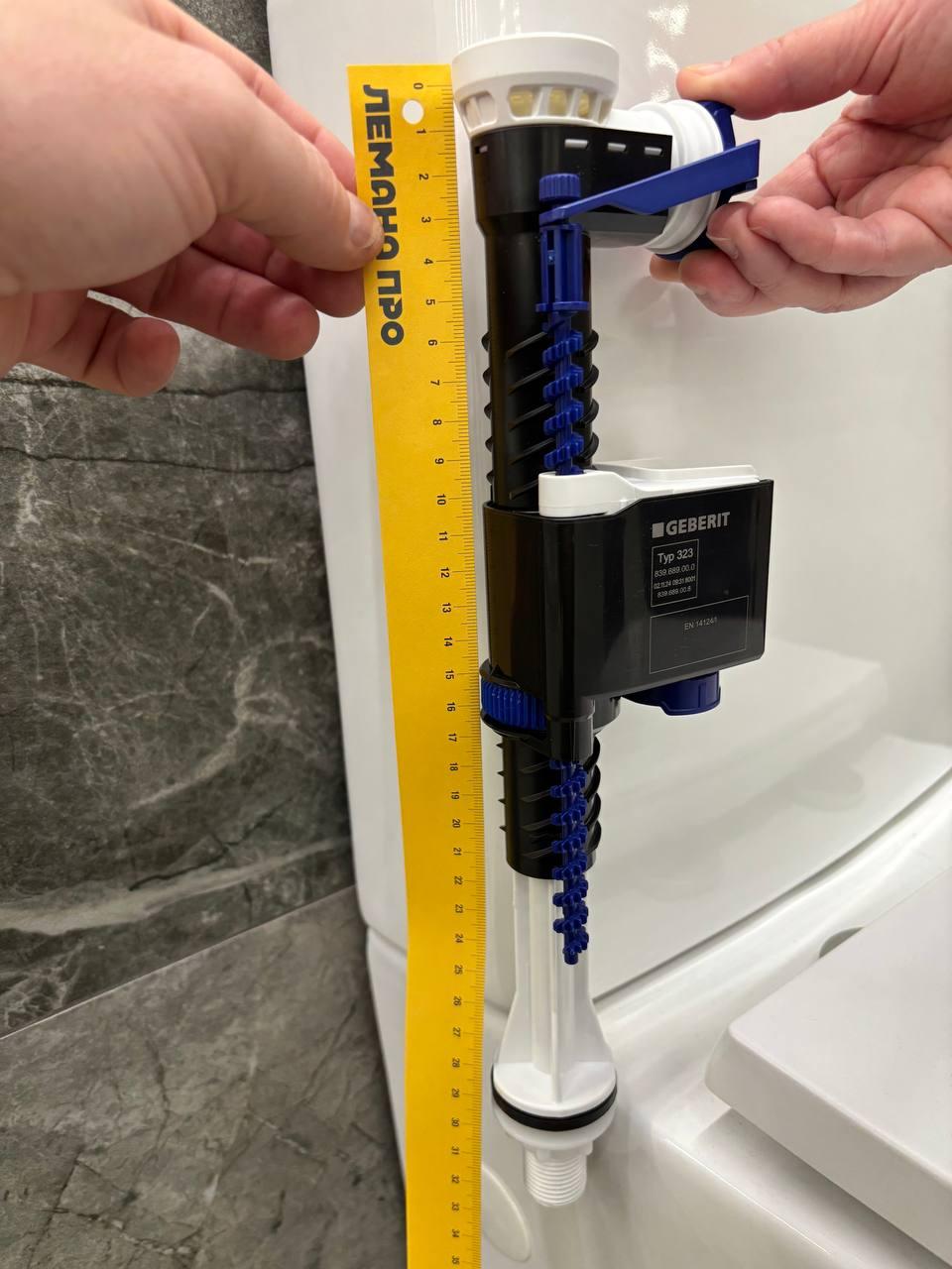 Наливной механизм Geberit Comfort Typ323 СУПЕРСМЫВ для установки в смывные керамические бачки унитазов с подводом воды снизу. Высота механизма - 293 мм (проверить высоту внутри Вашего бачка от днища до верхнего края бачка(не менее 293 мм) Установка механизма через отверстие в днище бачка Подключение к ХВС - наружная резьба G1/2" Регулировка уровня набора воды подвижным поплавком Защита от касания поплавка стенок бачка Рабочее давление от 0,5 до 10 атм. Встроенное шумоподавление Встроенный фильтр грубой отчистки Встроенная функция экономии воды Детали корпуса из высокопрочного PBT и ABS пластика Рабочая мембрана - силикон LSR Гарантия 2 года