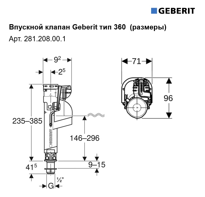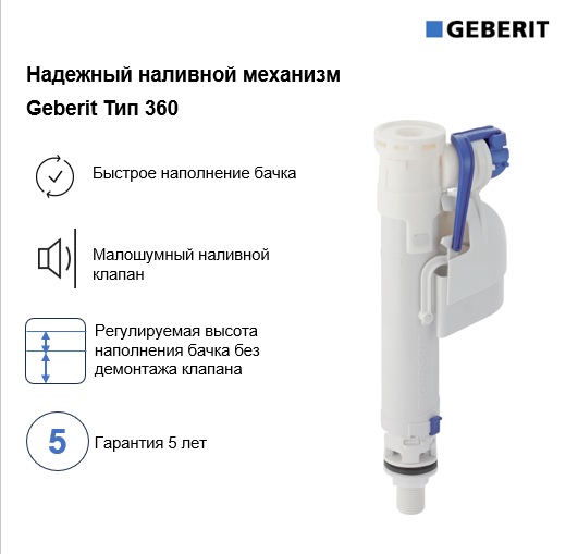 Наливной механизм Geberit Premium Typ360 СУПЕРСМЫВ телескоп Настройка высоты механизма: телескоп - подходит под любой бачок унитаза Наружная резьба G 1/2" подвод воды снизу Рабочее давление от 0,1 до 10 атм. Встроенное шумоподавление - 1 класс шумности 12 db(A) Быстрый набор воды – 0,19 л/сек Детали корпуса из прочного PBT и ABS пластика Защита от касания поплавка стенок бачка Встроенный фильтр грубой отчистки Не чувствителен к частичкам грязи до 1,5 мм. Мембрана из качественного силикона LSR Гарантия 5 лет с даты продажи.